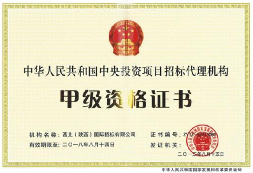 中央投資項目招標(biāo)代理甲級”資質(zhì)證書