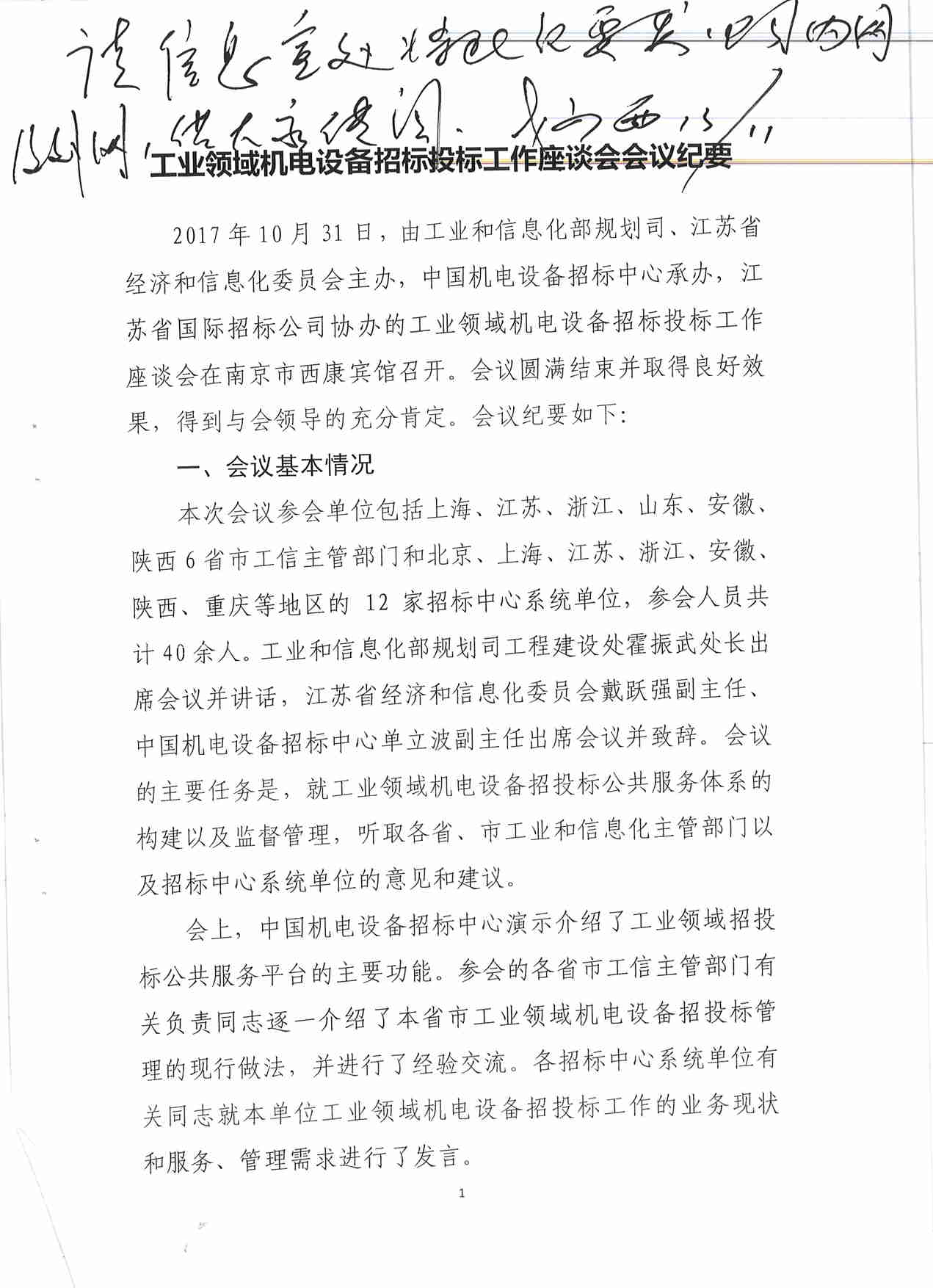 由工信部規(guī)劃司主辦,在南京召開(kāi)(2017年10月31日)的 “工業(yè)領(lǐng)域機(jī)電設(shè)備招投投標(biāo)工作座談會(huì)”《會(huì)議紀(jì)要》現(xiàn)已下發(fā)。全國(guó)6省市工信主管部門(mén)和12家招標(biāo)代理機(jī)構(gòu)參加此次座談會(huì),我公司董事長(zhǎng)總經(jīng)理戈乃西受邀參加會(huì)議。