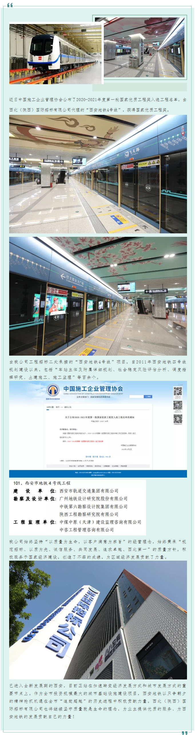 由西北國際招標公司代理的“西安地鐵4號線工程”榮獲國家優(yōu)質工程獎
