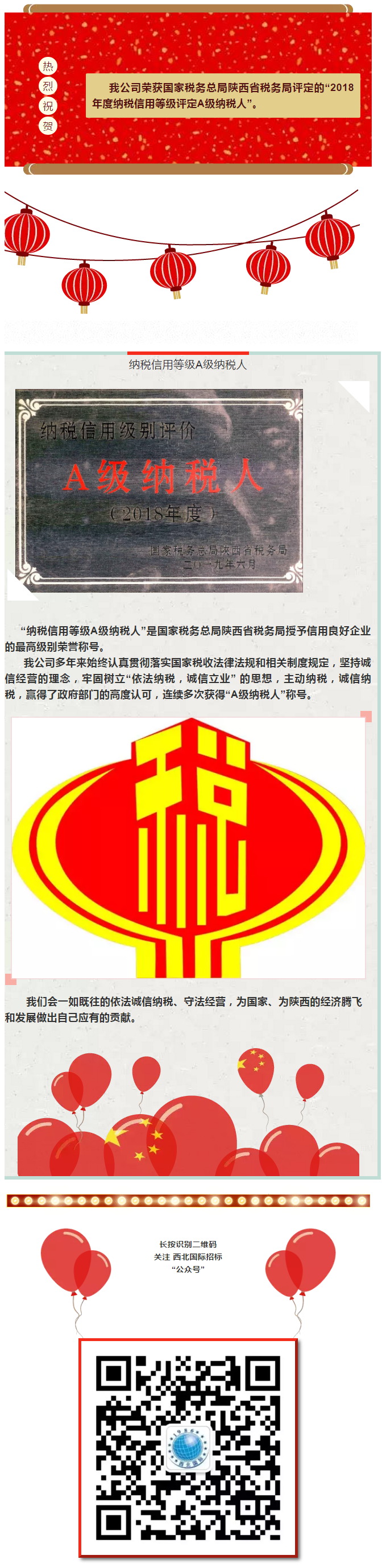 熱烈祝賀我司榮獲“2018年度納稅信用評價A級納稅人”