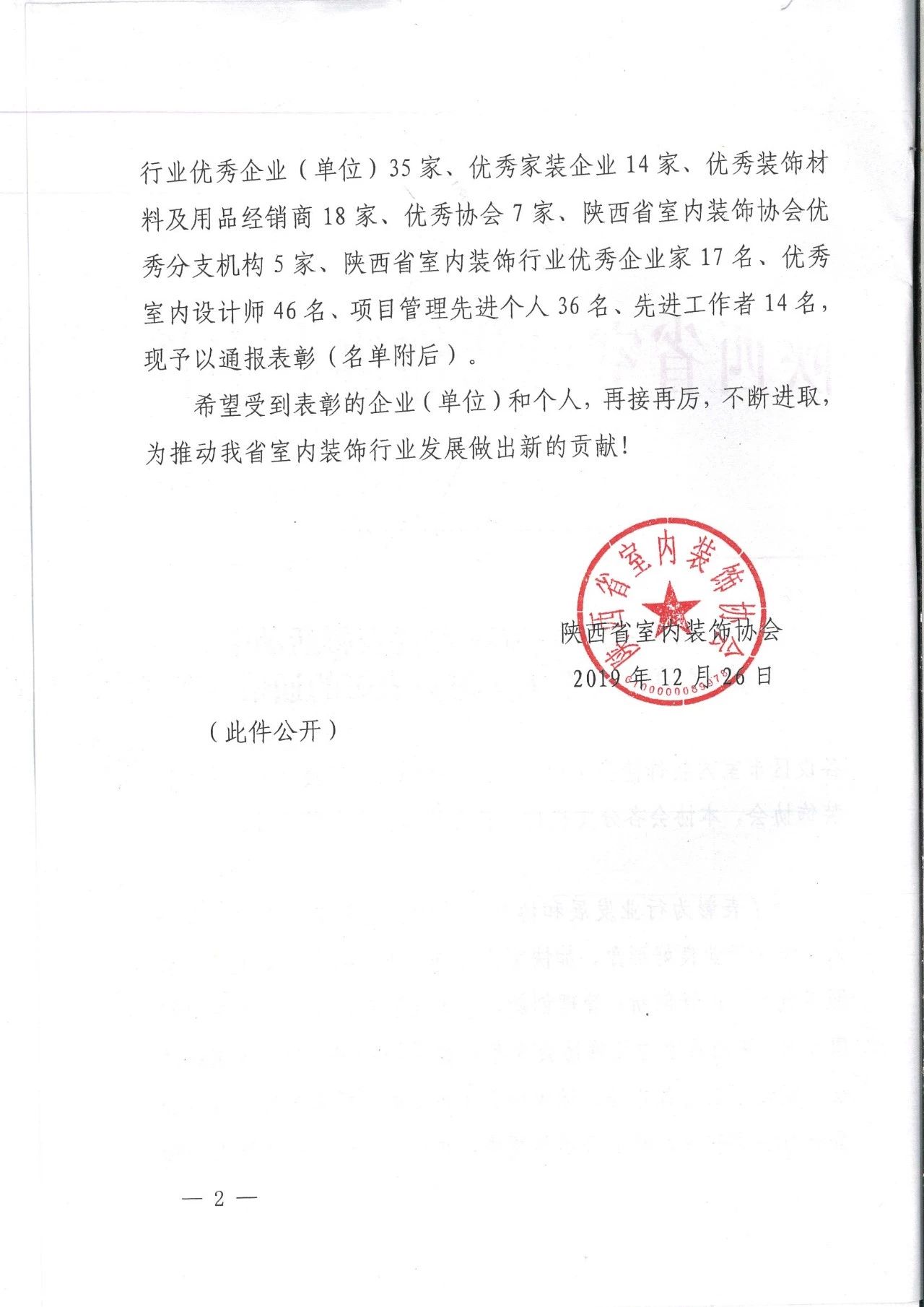 2019年12月26日,“陜西省室內(nèi)裝飾協(xié)會六屆三次理事會暨2018-2019行業(yè)表彰大會”在古都西安召開,我公司被陜西省室內(nèi)裝飾協(xié)會評為2018-2019陜西省室內(nèi)裝飾行業(yè)“優(yōu)秀招標代理機構”