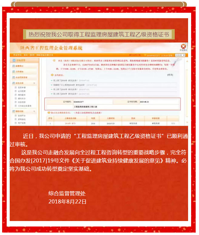 熱烈祝賀我公司取得工程監(jiān)理房屋建筑工程乙級(jí)資格證書(shū)